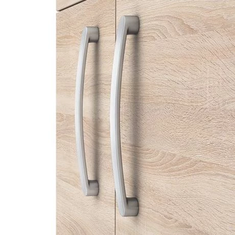 The Brooklyn modular furniture range combines up to date looks with practical storage. Features two soft close doors and plenty of space for toiletries, the Brooklyn floor standing vanity unit is perfect for adding modern style to any bathroom. This high quality Natural Oak textured wood effect vanity unit is supplied with a sleek white gloss thin-edge ceramic basin. All units are provided with quality matt chrome handles.