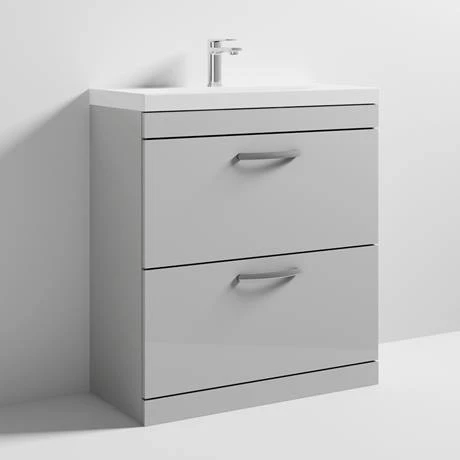 The Brooklyn modular furniture range combines up to date looks with practical storage. This 800mm floor standing vanity unit features 2 soft close drawers which provide plenty of storage space for toiletries, the Brooklyn vanity unit is perfect for adding modern style to any bathroom. This high quality gloss light grey vanity unit is supplied with a sleek gloss white thin-edge ceramic basin and quality matt chrome handles.