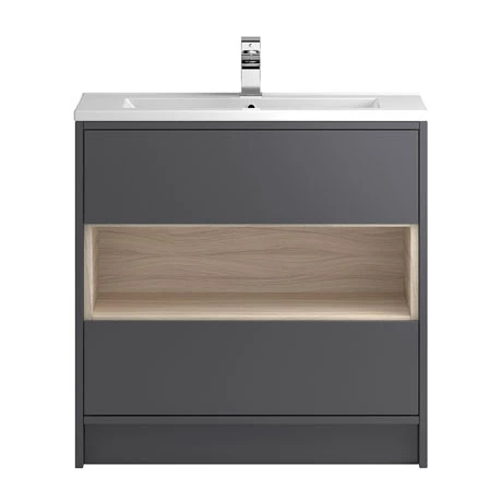Combine the minimalist look and latest technology of push open doors and drawers with open shelves in the Coast collection. The open shelves complement the fascia choice and provide immediate access to your bathroom necessities. Coast is ideal for most sizes of bathroom and its unique design makes it the perfect choice for a style statement. This stunning floorstanding 2 drawer unit will create a focal point in the bathroom as the driftwood open shelf with hints of grey is a great complement to the gloss fascia. Includes a single tap hole minimalist basin.